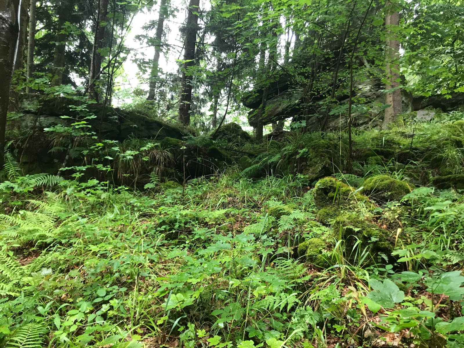 Leider ist es “von oben” immer noch etwas feucht, aber der Regen lässt zum Glück nach und als wir dann den Wald erreichen, stört uns der Regen kaum noch, im Gegenteil, teilweise kämpft sich sogar die Sonne durch die Wolken und wir erreichen auch bald die Bruderhöhle.