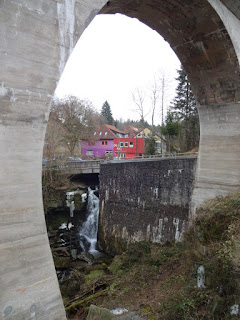 Wir kommen aus dem Wald und sehen das bekannte Eisenbahn-Viadukt, über das im Sommer die schwäbische Waldbahn mit ihrer Dampflok oder ihrer betagten Diesellok Waggons mit Wanderern und Touristen ziehen.