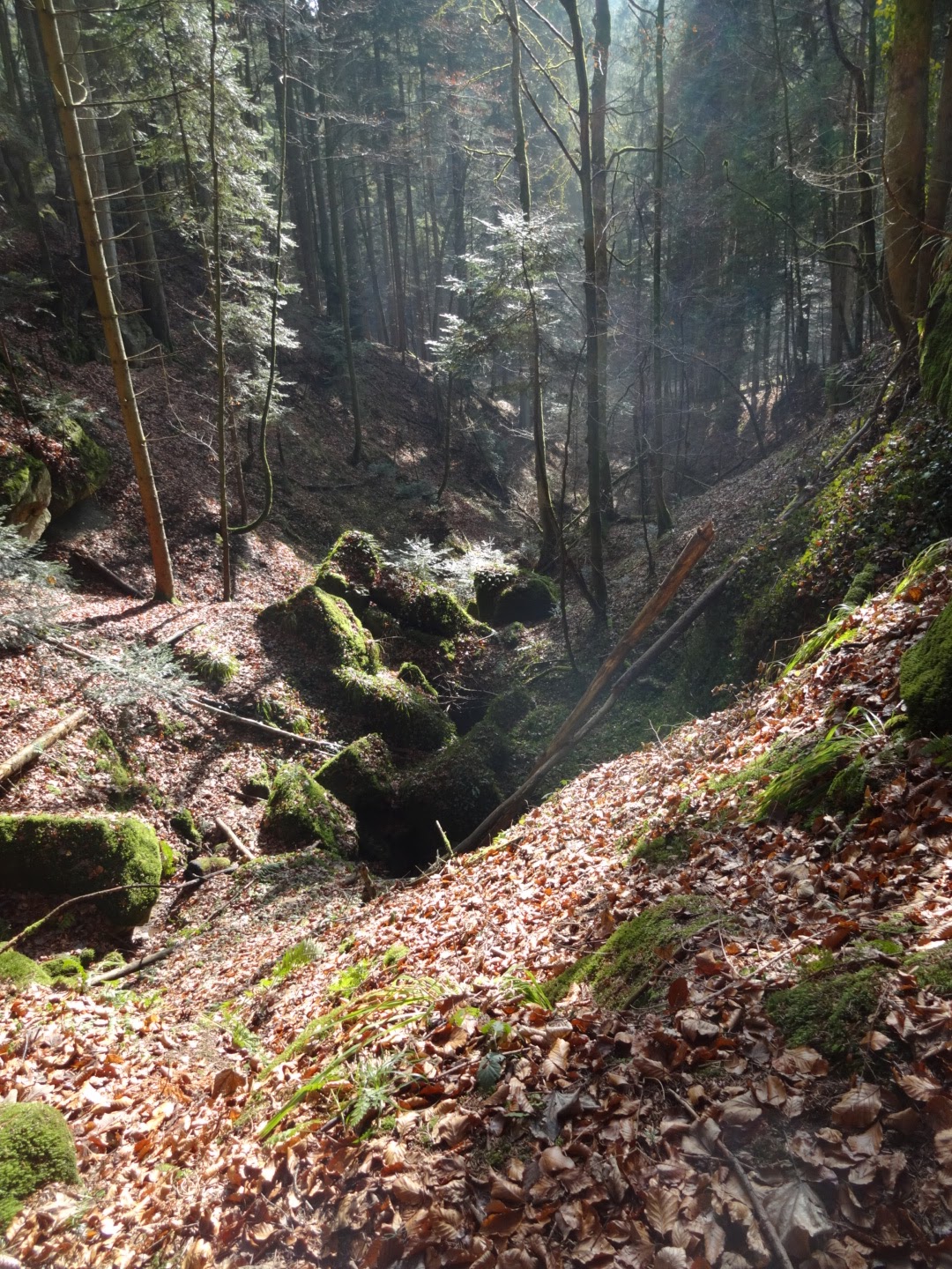 Wir gehen ein kurzes Stück an der Straße entlang bis zum Bahnhof Laufenmühle. Hier zweigt der Weg ab und wir gehen hinunter in die Wieslaufschlucht, wo wir am Bach entlang stapfen.